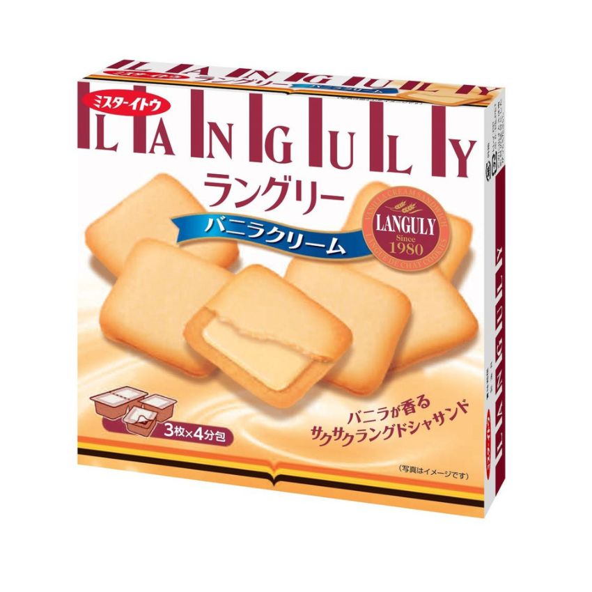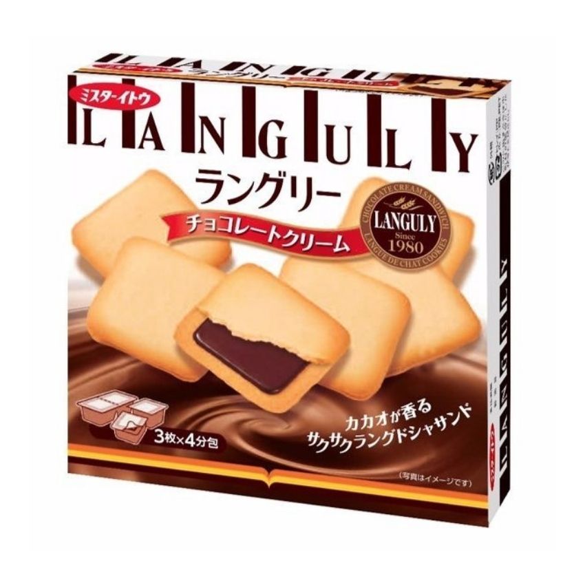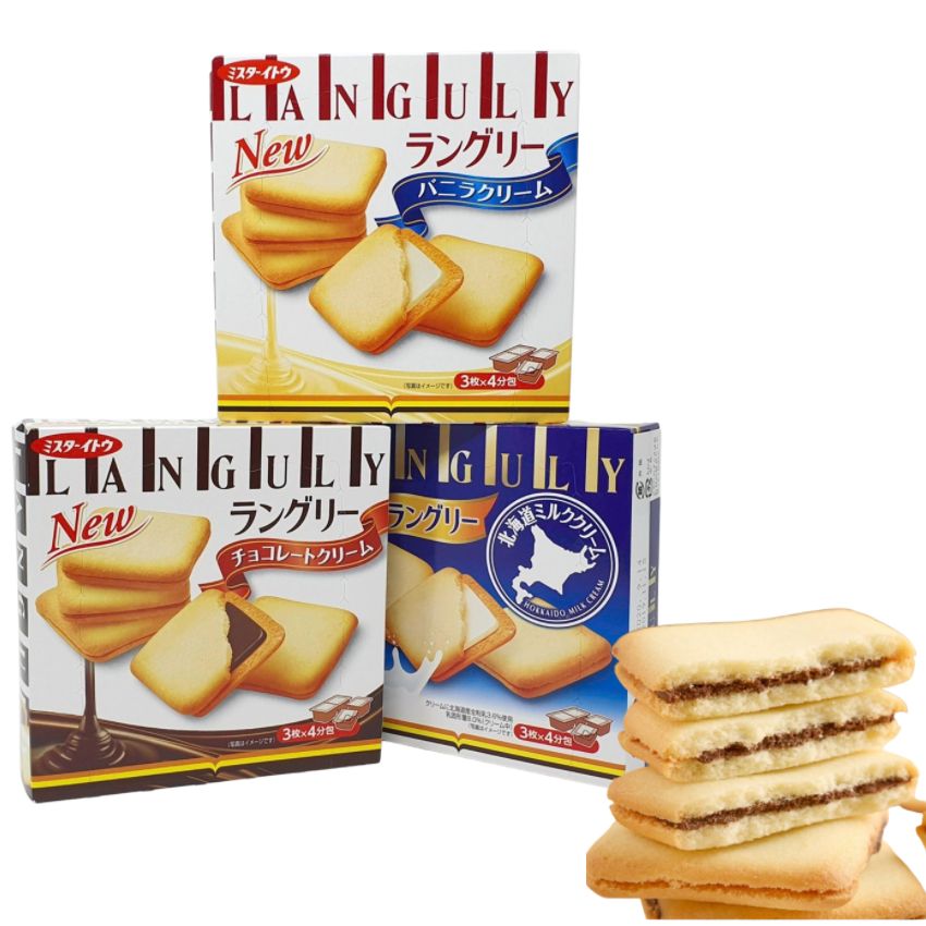 Bánh quy Mr Ito Languly kẹp kem 12 chiếc (3 vị) có hương vị thơm ngon hấp dẫn, ngọt dịu, vị kem sô-cô-la đặc trưng mang đến trải nghiệm thú vị khi thưởng thức. Phần nhân kem mềm mịn bên trong kết hợp với vỏ bánh giòn tan sẽ khiến bạn ăn hoài không chán.