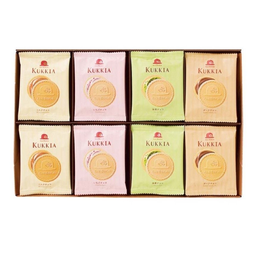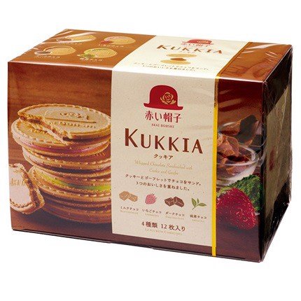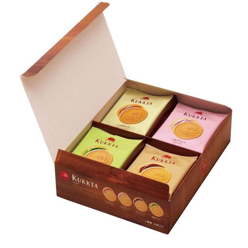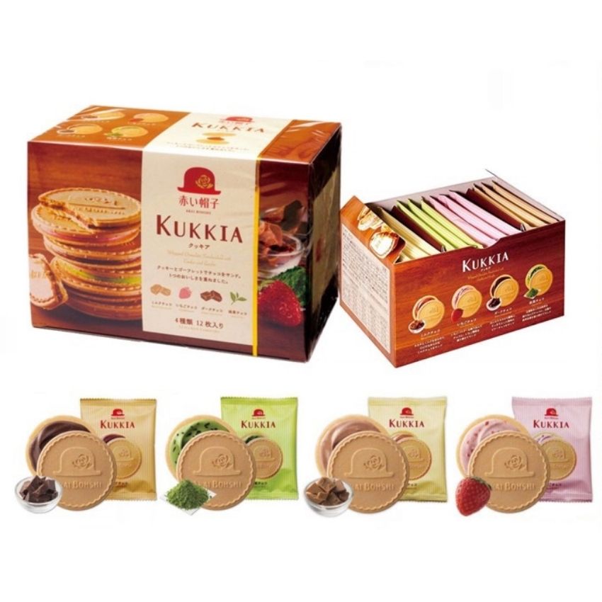 - Bánh quy hộp Kukkia cao cấp là sự kết hợp giữa vỏ bánh quy nướng mỏng giòn tan bên ngoài kẹp lớp nhân kem mềm thơm của 4 vị: dâu tươi, cà phê, sô cô la và trà xanh mang đến sự trải nghiệm mới lạ,thú vị đồng thời mang lại giá trị dinh dưỡng.