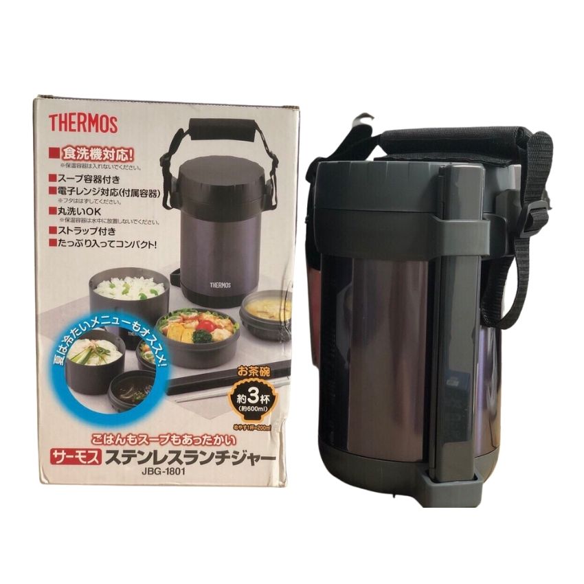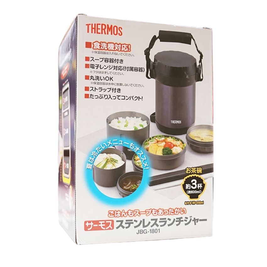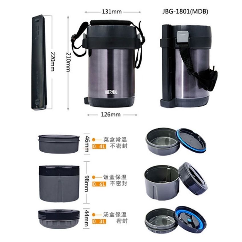 - Hộp cơm giữ nhiệt 3 ngăn Thermos JBG-1801 được giữ nhiệt bằng bình ủ thép không gỉ,bên trong có 3 ngăn,mỗi ngăn đều có nắp riêng biệt ,ngăn không cho chất lỏng bị chảy ra ngoài và chất liệu của 3 ngăn bằng nhựa cao cấp,an toàn,có thể sử dụng dc trong lò vi sóng