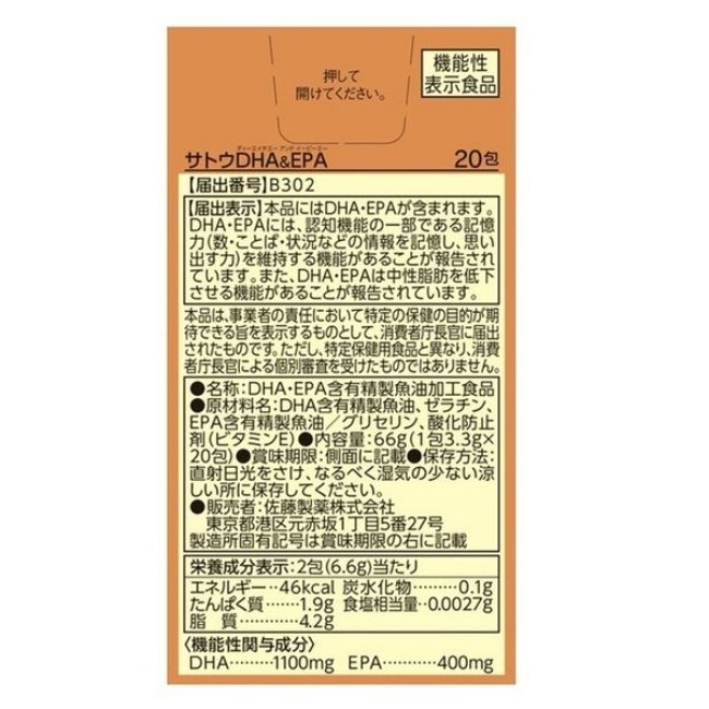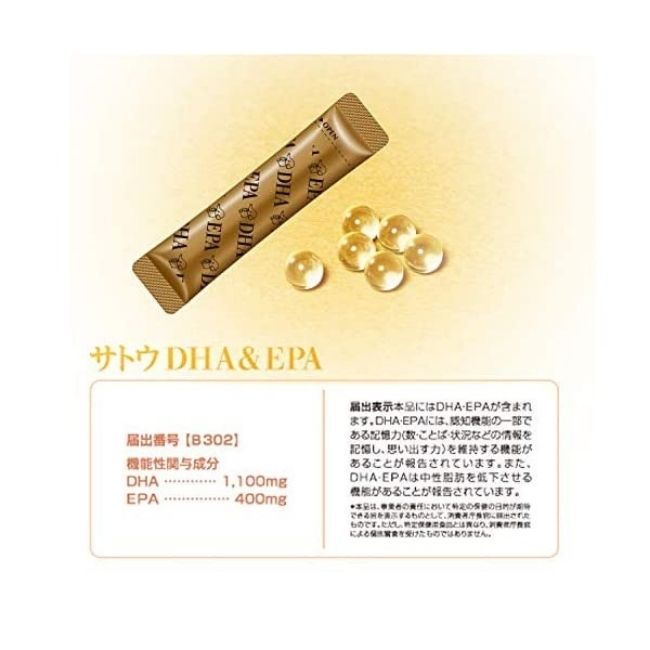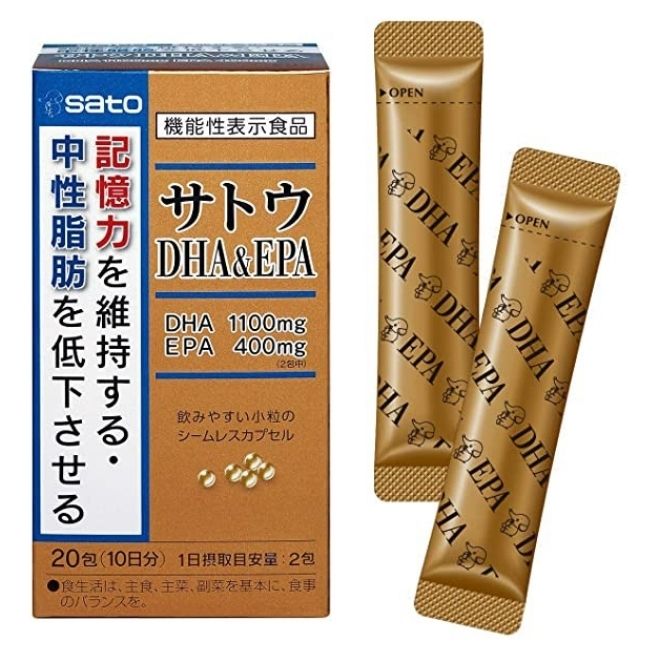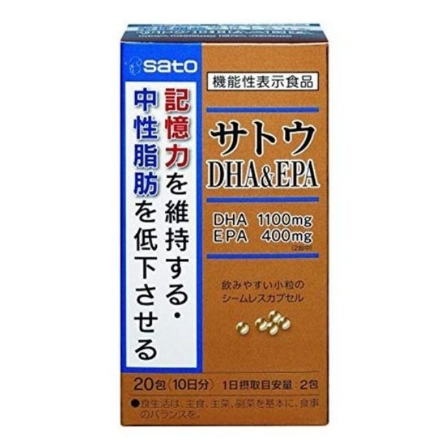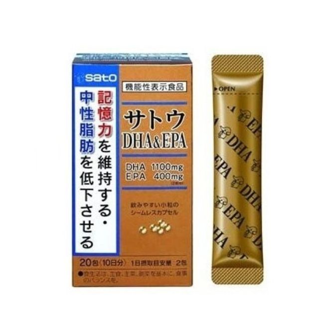 Viên uống bổ não Sato bổ sung DHA&EPA hộp 20 gói- Nhật Bản được chiết xuất hoàn toàn từ thiên nhiên với hàm lượng DHA 1100 mg và EPA 400mg.