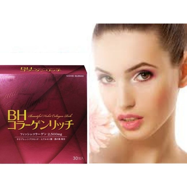 Collagen Nichiei Bussan Beautiful Habit Rich bổ sung hàm lượng cao 2.500mg chiết xuất collagen peptide cùng tinh chất nhau thai giúp dưỡng da căng mịn, đàn hồi, đồng thời nuôi dưỡng làn da sáng hồng, mịn màng.