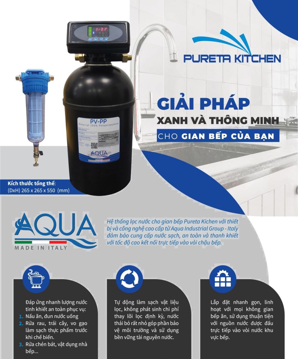 Hệ thống lọc nước cho gian bếp Pureta Kichen với thiết bị và công nghệ cao cấp từ Aqua Industrial Group - Italy đảm bảo cung cấp nước sạch, an toàn và thanh khiết với tốc độ cao kết nối trực tiếp vào vòi chậu bếp.