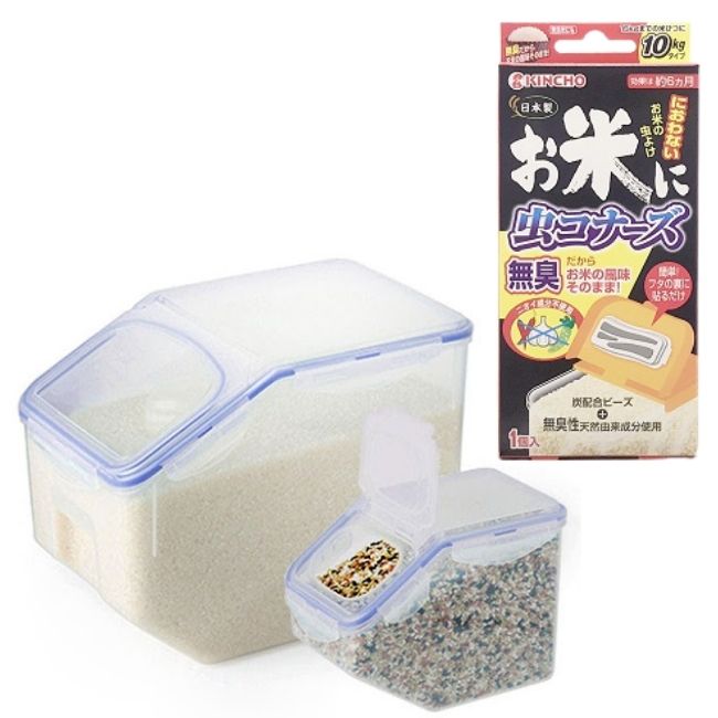B2: Bóc cả 2 mặt miếng dính vuông ở bên ngoài và dán 1 mặt vào tấm dán, mặt còn lại dán vào nắp trong của thùng đựng gạo. (Có thể không dùng miếng dán mà đặt trực tiếp vào thùng gạo cũng được)