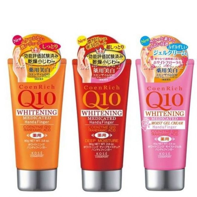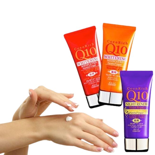 - Kem dưỡng da tay Q10 Kosé với thành phần Q10, chiết suất nhân sâm và chiết xuất thảo mộc tự nhiên sẽ thẩm thấu vào sâu trong gia giúp hỗ trợ quá trình tái tạo tự nhiên của da, bổ sung dưỡng chất giúp dưỡng ẩm và làm mịn da.