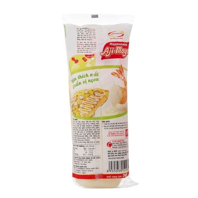 - Sốt mayonnaise Aji-mayo Ajinomoto là sốt gia vị đa năng phù hợp với nhiều món ăn đặc biệt là các món chấm và trộn. Sản phẩm là sự hòa quyện giữa vị béo ngậy của dầu thực vật, trứng gà tươi cùng vị chua dịu nhẹ của dấm.