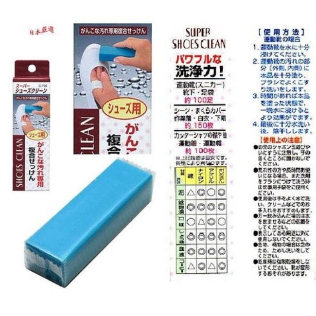 Cách sử dụng: làm ướt giày, chà nhẹ thanh sản phẩm lên những chỗ có vết bẩn và ngâm, rồi giặt sạch.