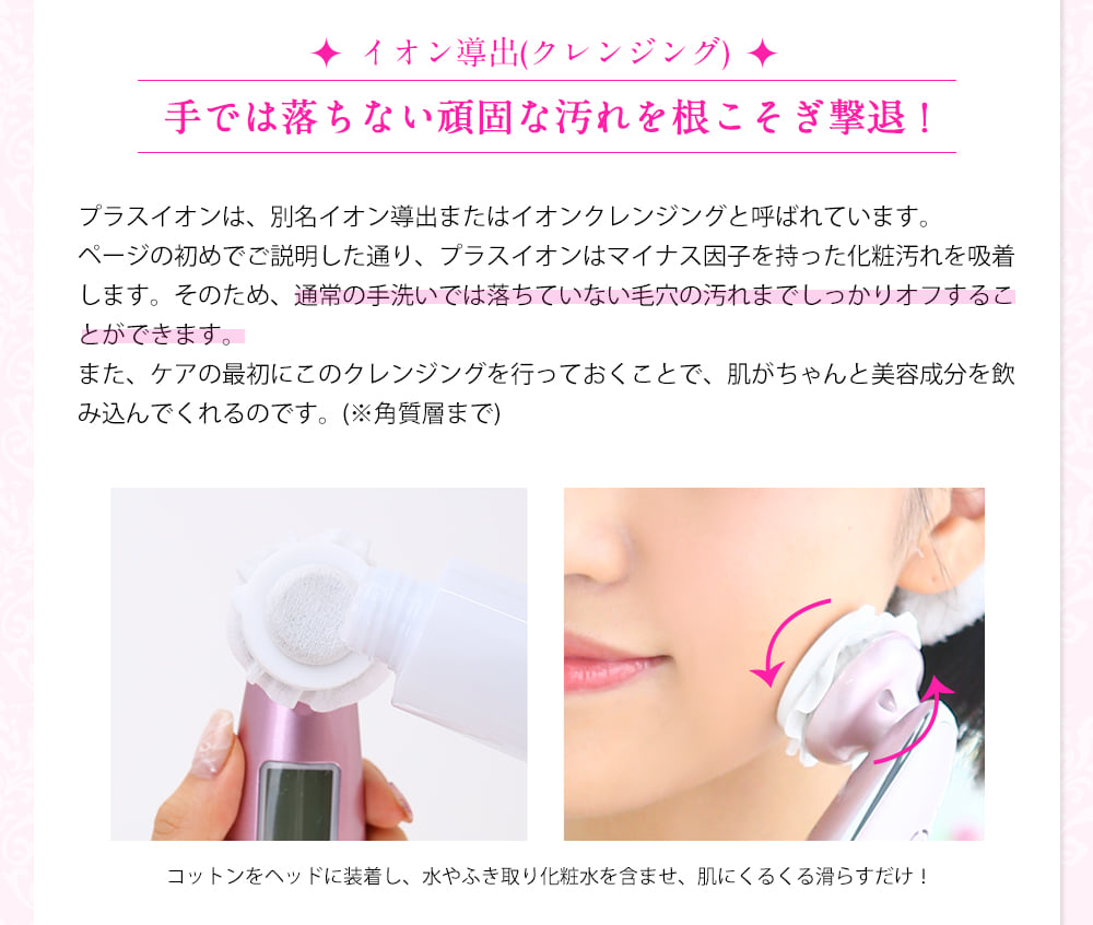 - Làm sạch sâu : sử dụng công nghệ ion dương và sóng âm châm chích hút các chất bẩn mang điện tích âm mà mắt mình không nhìn thấy và không thể rửa sạch bằng tay. Giúp da sạch hơn khỏe hơn