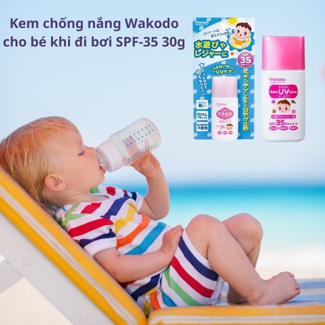 Kem chống nắng Wakodo cho bé khi đi bơi SPF-35 30g giúp chống lại tia cực tím làm ảnh hưởng tới làn da của bé yêu, hiệu quả kéo dài nhiều giờ