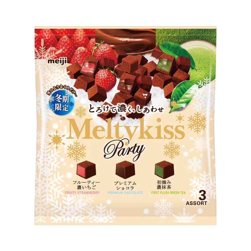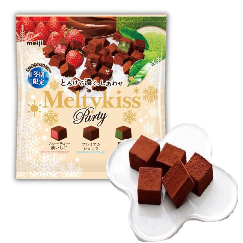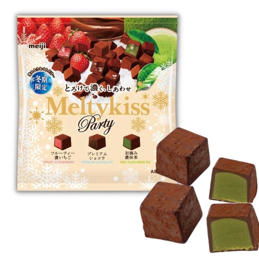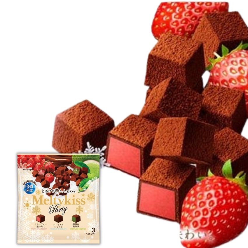 - Socola vị dâu Meiji Melty Kiss Party Assort những quả dâu tây chín mọng và những lá trà xanh tươi mát cùng với bơ ca cao, sữa bột nguyên chất, sẽ có tác dụng là kích thích tín đồ đam mê ăn uống vì có dâu tây và matcha đến từ Nhật Bản.