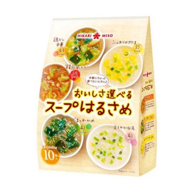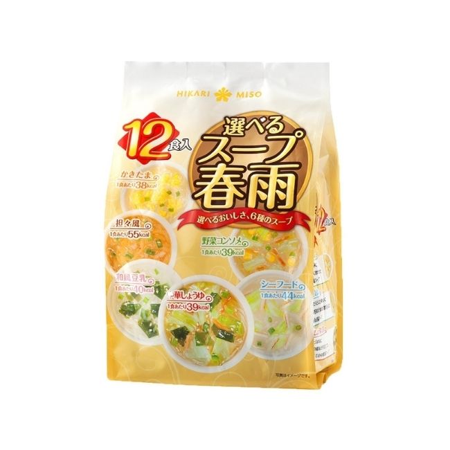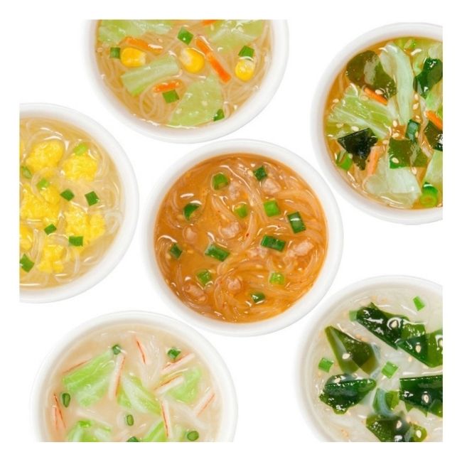 Mỗi gói gồm 6 vị sau đây: vị cá ngừ, vị thịt lợn miso, súp đậu nành, súp rau củ, hải sản, vị trứng.