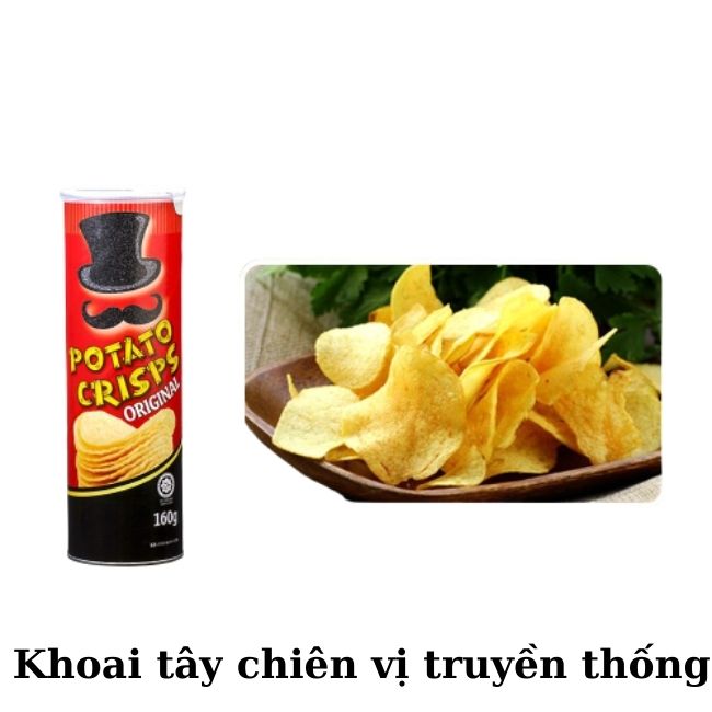 - Bạn sẽ thích kết cấu giòn hoàn hảo và hương vị tự nhiên của khoai tây, được nêm đúng cách với một lượng muối vừa phải! Đóng gói trong một hình trụ có thể có trọng lượng tịnh 160g, Sản phẩm này được chứng nhận Halal về thực phẩm quốc tế.