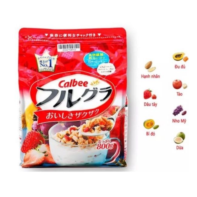 - Ngũ cốc Calbee chứa rất nhiều loại hạt và trái cây có giá trị dinh dưỡng cao, không thêm gia vị mà tận dụng những hương vị vốn có của loại trái cây đó. Từ trẻ nhỏ đến người già, ngay cả người bệnh tiểu đường cũng rất rất thích thú với loại ngũ cốc Calbee của Nhật bởi nó rất bổ dưỡng và thơm ngon. Nó như là một loại ngũ cốc giàu chất dinh dưỡng, chứa nhiều loại trái cây và hạt được sấy khô như là yến mạch, lúa mạch, táo, nho, đu đủ, dâu tây, dừa, ngô, bí ngô, hạnh nhân, gạo nâu, sữa….