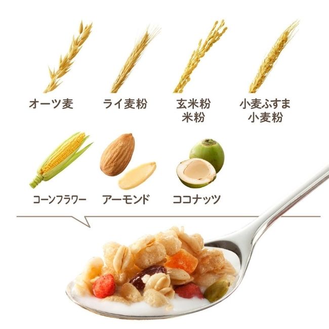 - Thành phần gồm: Yến mạch, lúa mạch đen, đường và các loại trái cây sấy khô như đu đủ, nho khô, táo, dâu tây, dừa, dầu thực vật, gạo, dextrin, chất xơ hòa tan (dextrin khó tiêu hóa), bột mì, ngô, hạt bí ngô, hạnh nhân, muối, cám lúa mì , gạo nâu, glycerin, tinh bột biến đổi, natri citrat sắt, đại lý nhũ hoá , acidulant, chất chống oxy hóa (vitamin E và Rosemary chiết xuất), niacin, axit pantothenic Ca, vitamin B1, vitamin B6, vitamin A, axit folic, vitamin D, Vitamin B12.
