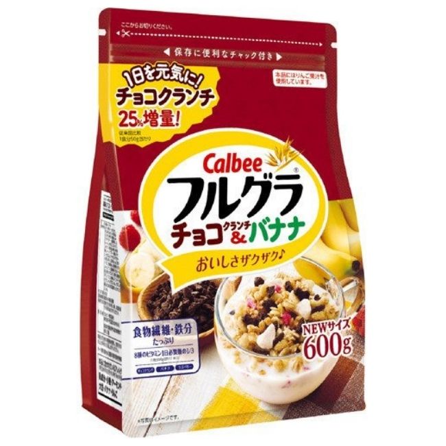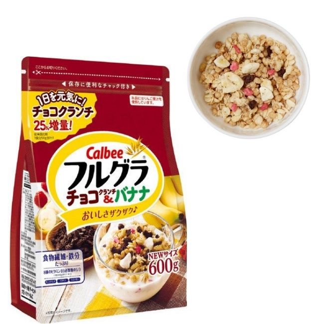 Ngũ cốc Calbee của Nhật Bản có vị socola và chuối gói 600g là dòng ngũ cốc duy nhất trong họ hàng nhà Calbee được cắt giảm 25% lượng đường, giúp ăn vào không ngấy, không béo thậm chí giúp giảm cân hiệu quả.