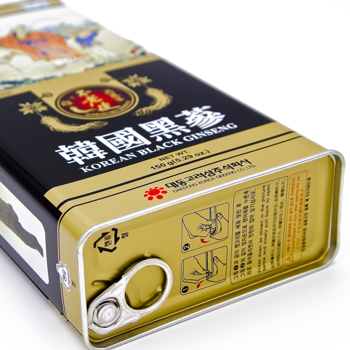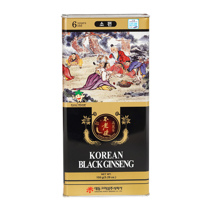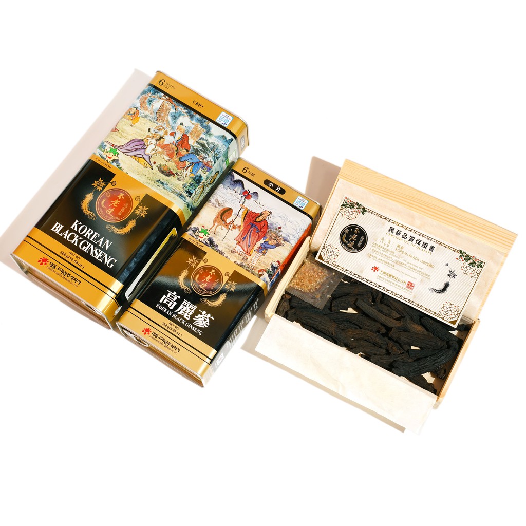 - Hắc sâm củ khô 150g hộp thiếc Daedong Hộp gồm 16 đến 25 củ hắc sâm cao cấp được chế biến từ sâm tươi trồng tại Geumsan “vựa sâm chất lượng tốt nhất” Hàn quốc, các củ sâm được nén chặt hàm lượng nước dưới 15%, hình dáng đẹp hai chân rõ ràng.
