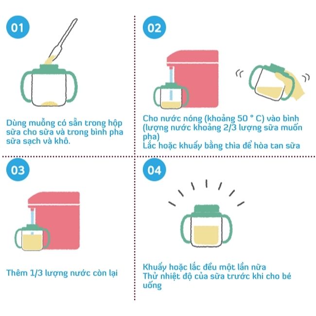 - Thêm nước sôi vừa đủ lượng nước chỉ định, khuấy đều. Khi cho trẻ dùng, hãy đảm bảo nhiệt độ pha gần bằng nhiệt độ cơ thể.