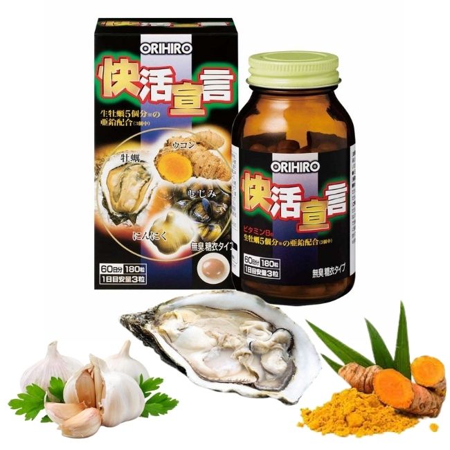 Tinh chất hàu tươi - tỏi - nghệ Orihiro lọ 180 viên với tinh chất hàu tươi giúp hỗ trợ tăng cường sinh lý nam giới, cải thiện chất lượng tinh trùng và gia tăng khả năng thụ thai.