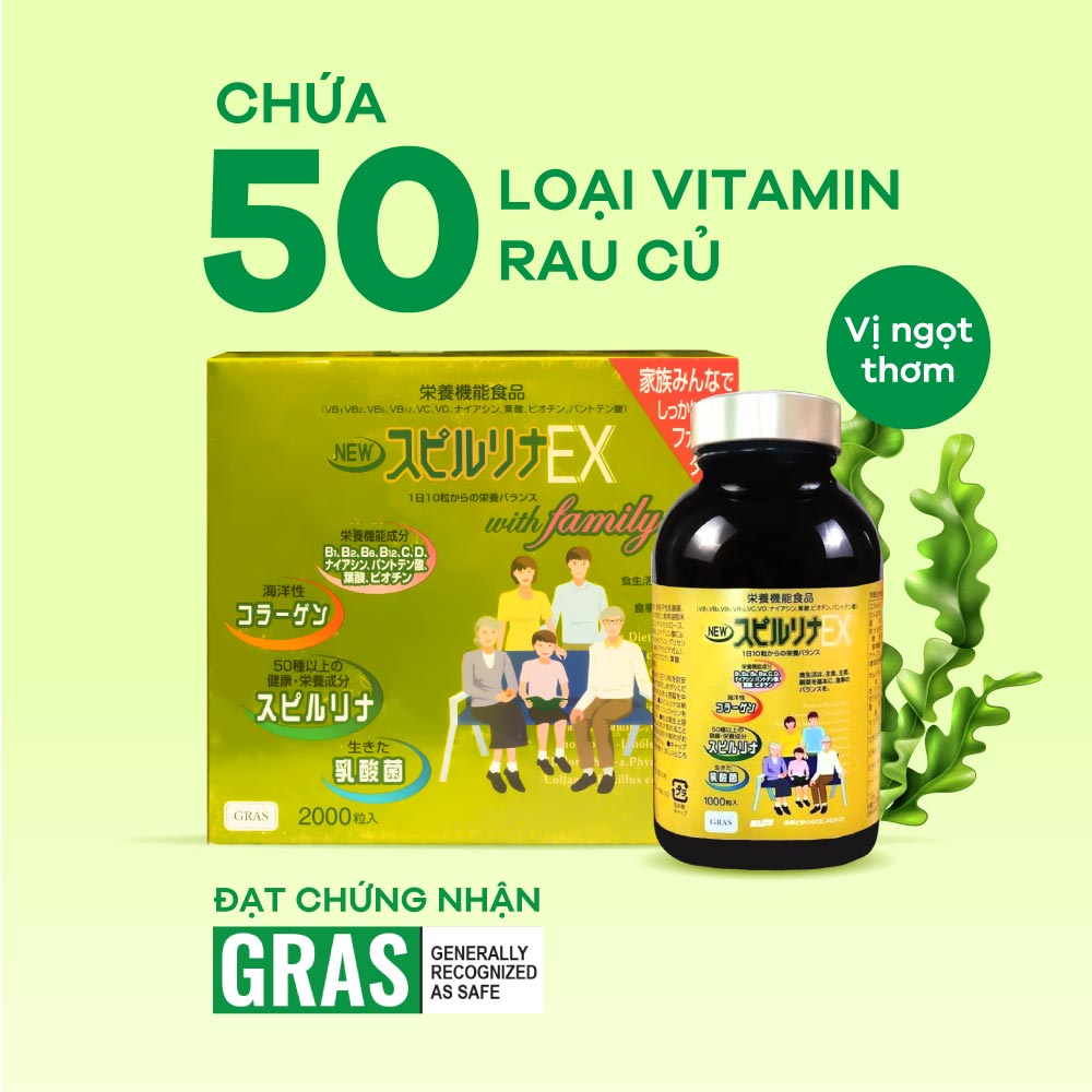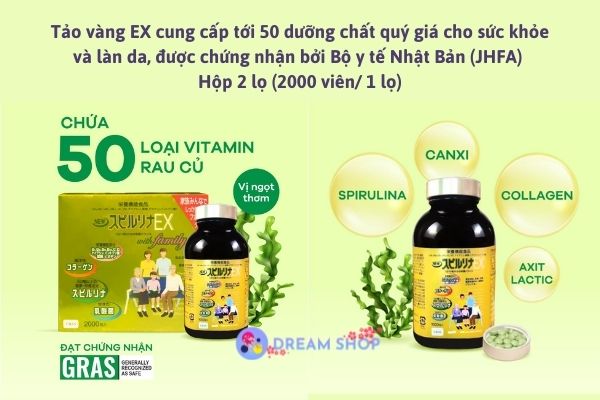 Tảo vàng EX set 2 2000 viên cung cấp tới 50 dưỡng chất quý giá cho sức khỏe và làn da, được chứng nhận bởi Bộ y tế Nhật Bản (JHFA).